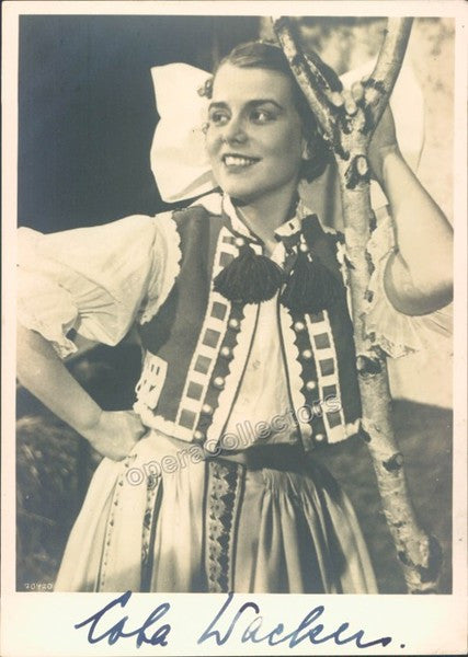 Signed photo postcard of the German soprano (1909-1985), shown as Marie in The Bartered Bride, dated in 1941. Size is 4 x 5.75 inches, it is also handwritten and signed on verso and in excellent condition