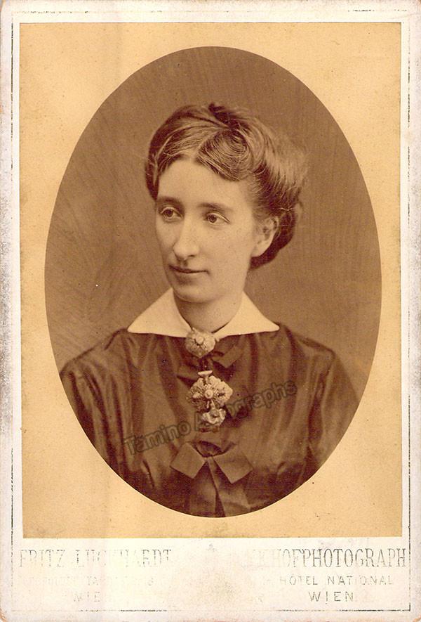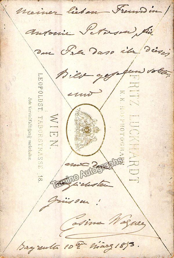 Signed cabinet photo, showing her young - signature is on verso, inscribed and dated by her in Bayreuth, 1873. A photo by Fritz Luckhardt, Vienna, size is 4.5 x 6.5 inches, some wear, in very good condition.