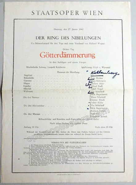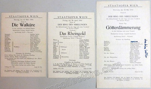 Wagner opera programs, performances at the Staatsoper Vienna, 1942-1944. Gotterdammerung, 27 January 1942. Das Rheingold, 18 April 1944. Gotterdammerung, May 8th, 1944. Conductor: Leopold Reichwein. Die Walkure, 12 March 1944. Conductor: Rudolf Moralt. Set of 4 programs (during WWII programs of the Vienna Staatsoper were reduced to one single page due to paper shortage).