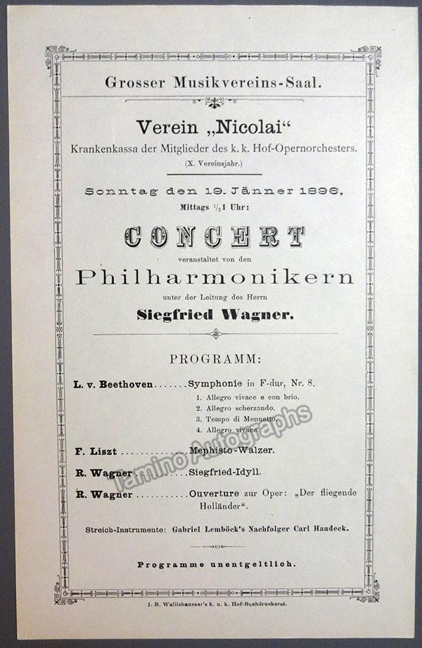 Siegfried Wagner conducts the Vienna Philharmonic Orchestra, January 19th, 1896. Beethoven, Liszt, Richard Wagner. Size is 6 x 9.25 inches, 1 page
