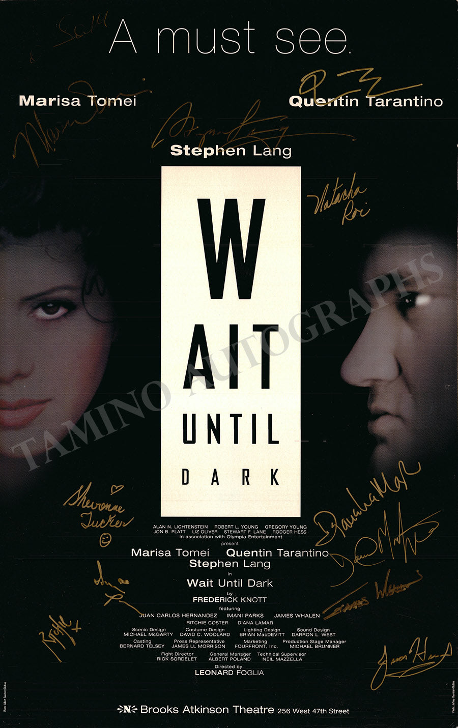 Original poster for a Broadway production of the musical Wait Until Dark at Brook Atkinson Theatre, signed by Marisa Tomei and Quentin Tarantino and many members of the cast.