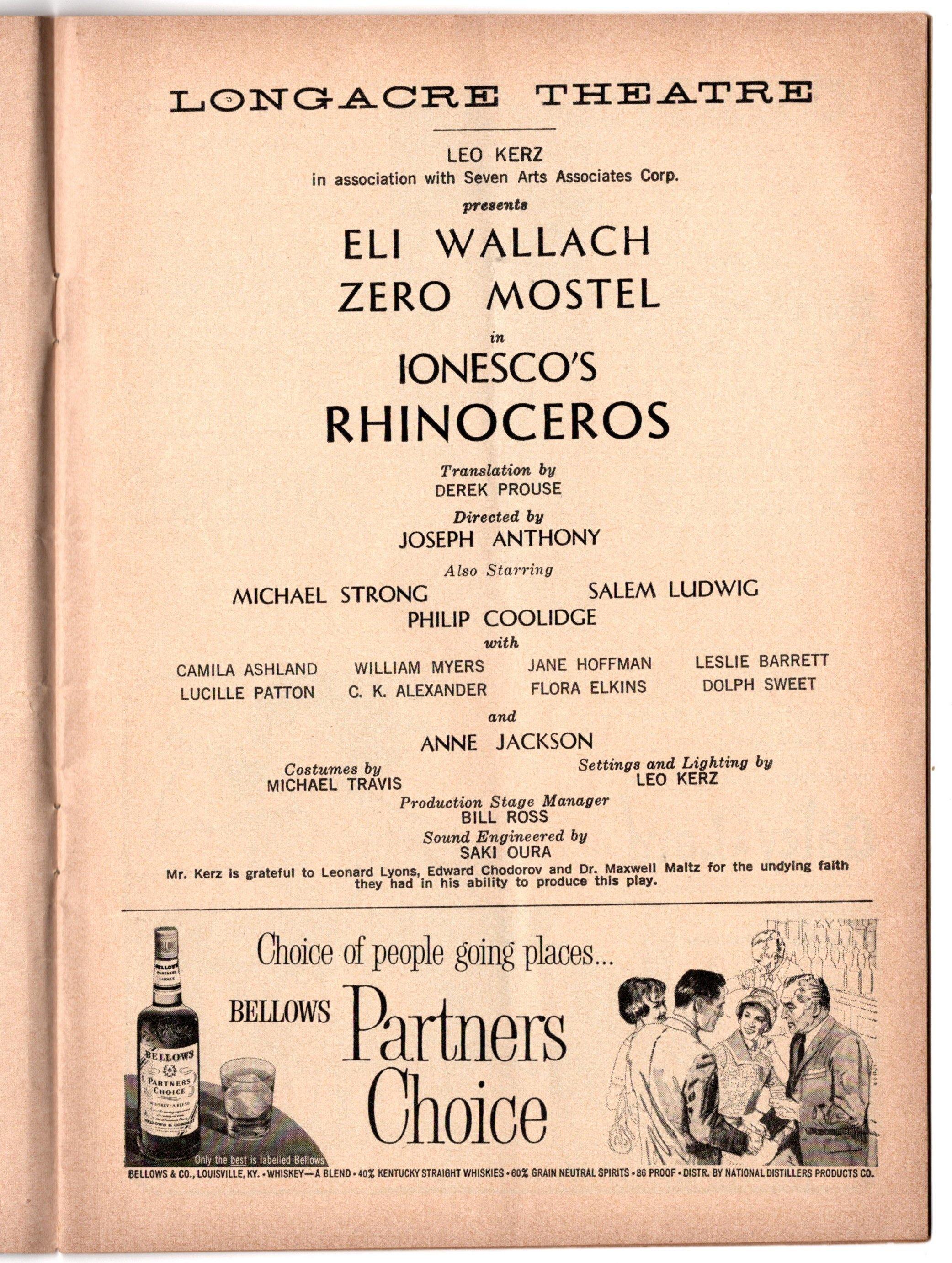 Wallach, Eli - Signed Program "Rhinoceros" - Tamino Wallach, Eli - Signed Program "Rhinoceros" - Tamino