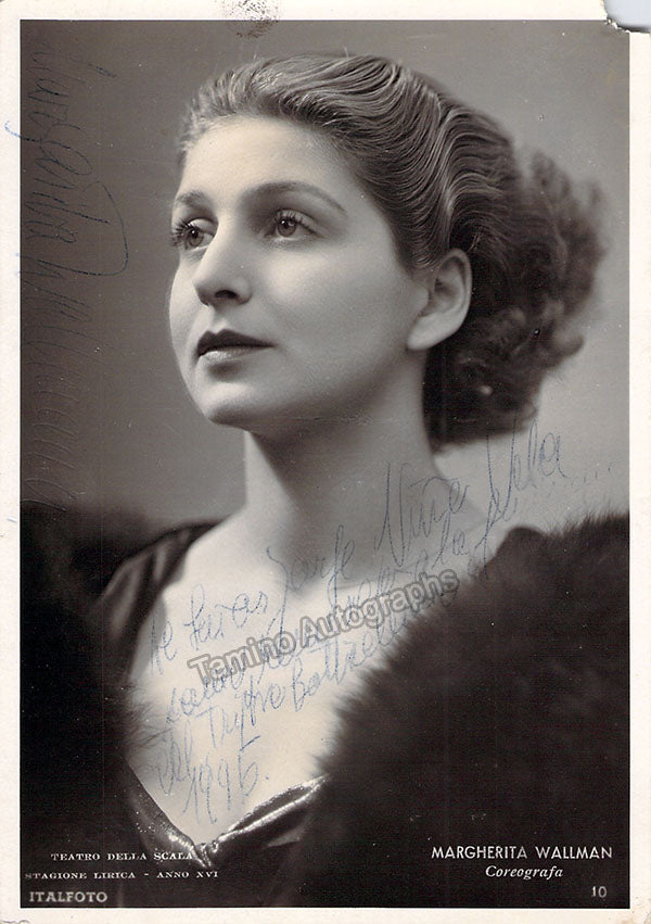 Fine photo postcard signed and inscribed by her, shown young, photo by Teatro La Scala, Milan, dated ca.1945.  Size is 4.2 x 5.8 inches, crack over the upper-right corner with loss of paper, otherwise in very good condicion.