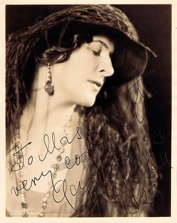 Polish soprano and creator of botanical gardens (1887-1984), whose fourth husband's heavy promotion of her opera career influenced the screenplay for Orson Welle's legendary film Citizen Kane. Signed Photo, shown in role, inscribed and dated in 1929. Stamped on verso by Underwood & Underwood photographers, Washington, D.C. Size is 7.5 x 9.5 inches, in excellent condition.