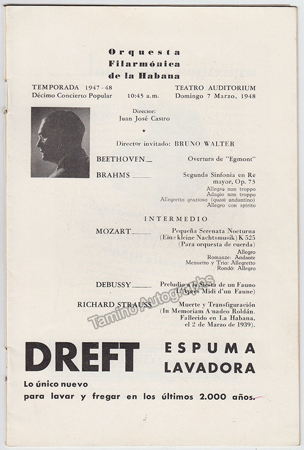 Program for a performance of the German conductor at Teatro Auditorium, Havana, Cuba, March 7th, 1948, conducting the Havana Philharmonic Orchestra, signed by him on his photo page.  Size is 6.1 x 9.2 inches, full program with all pages and covers, some ink-leakage on signature, otherwise in very goo condition.