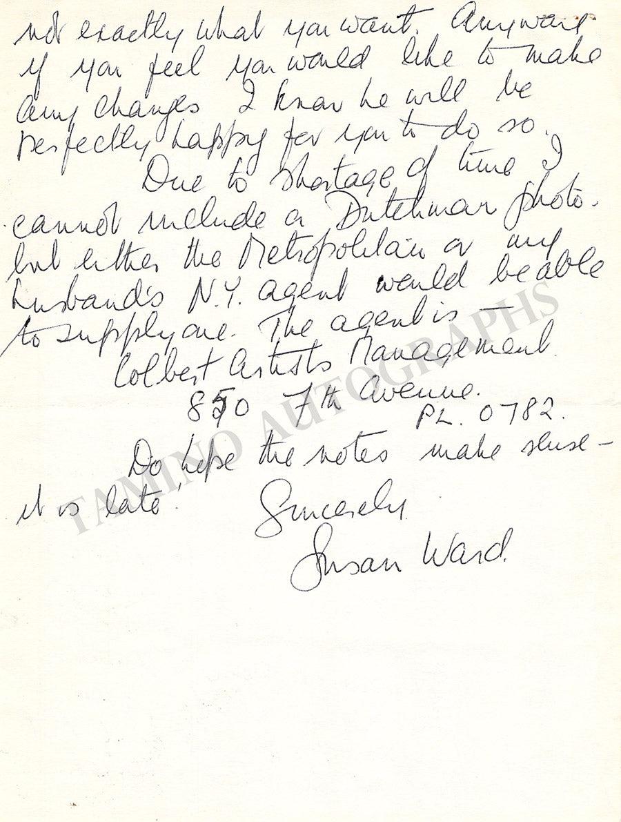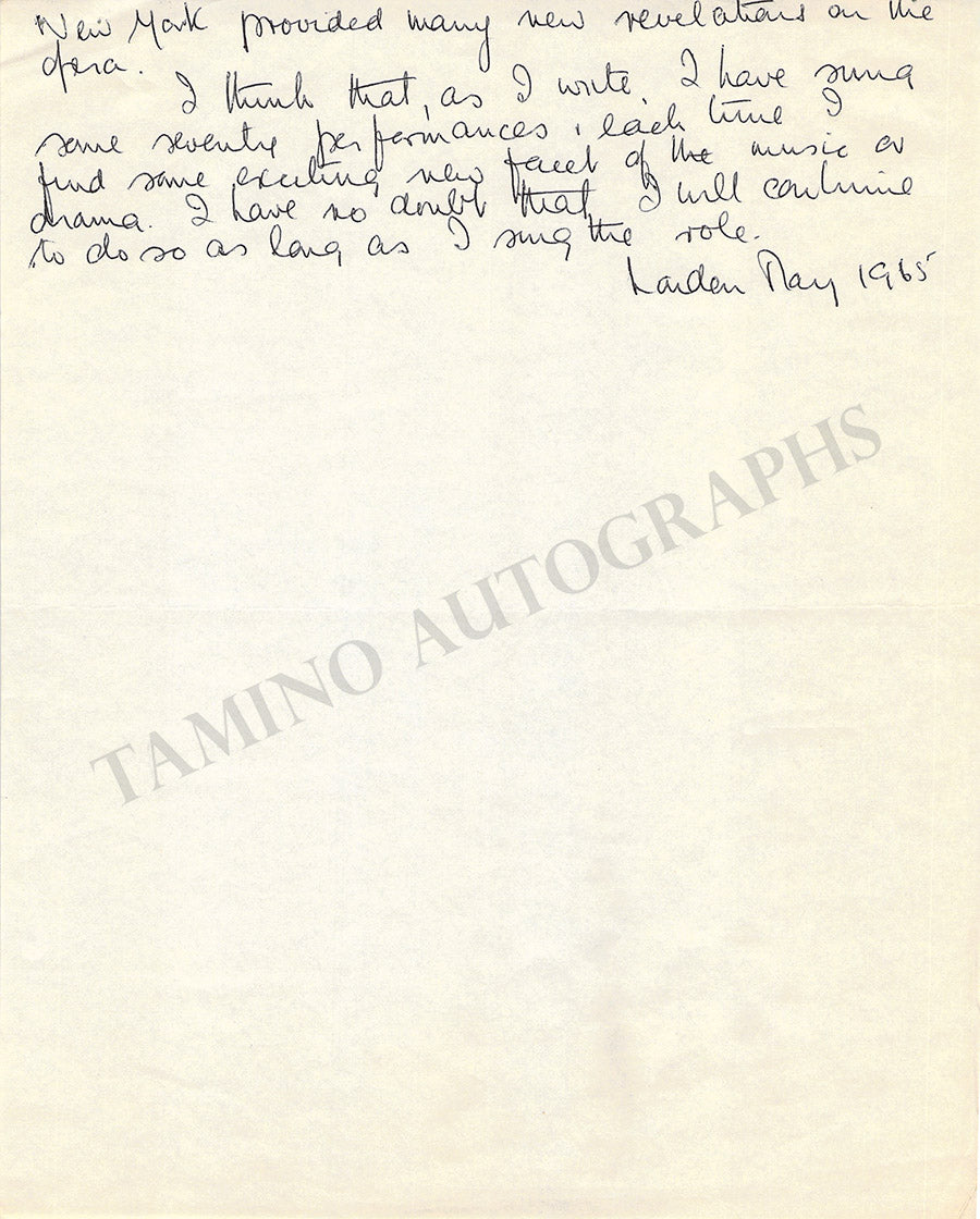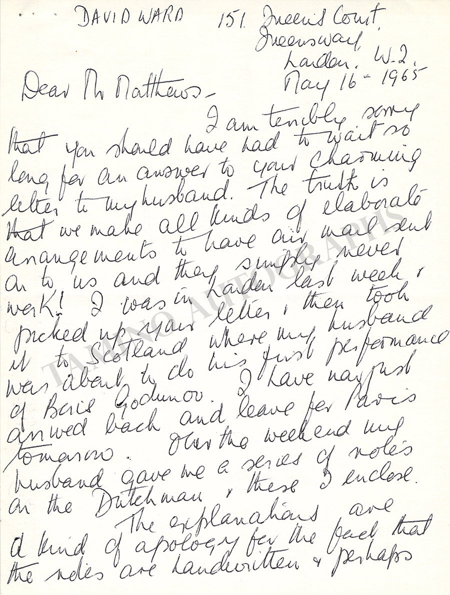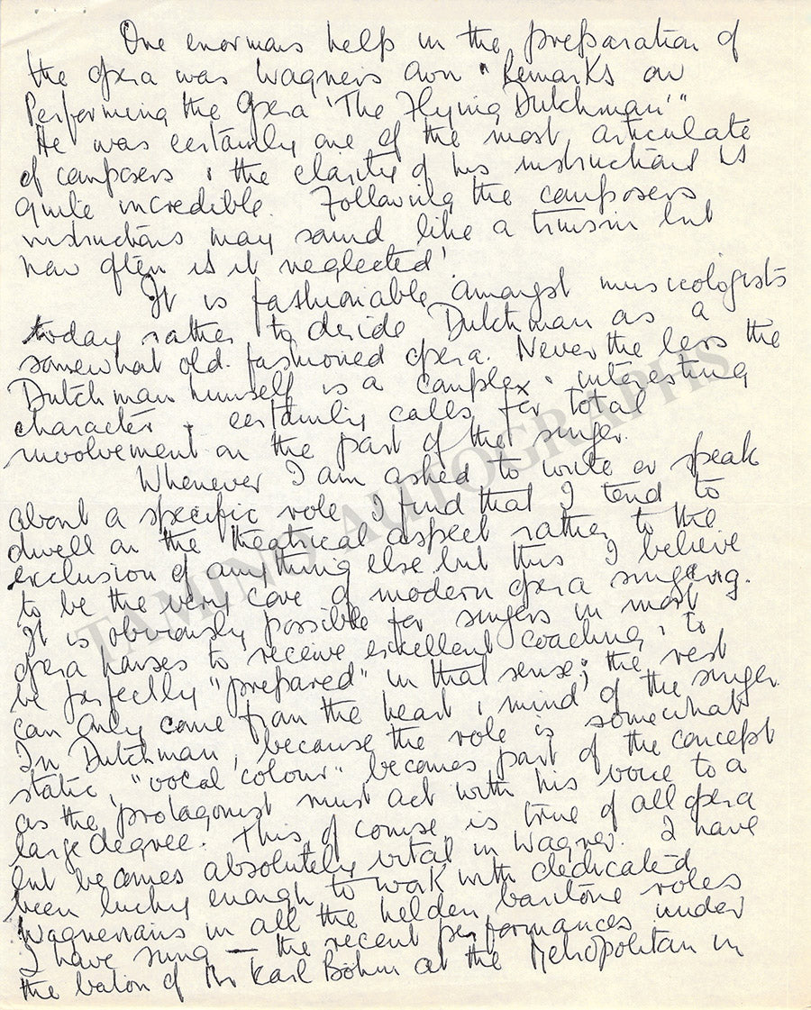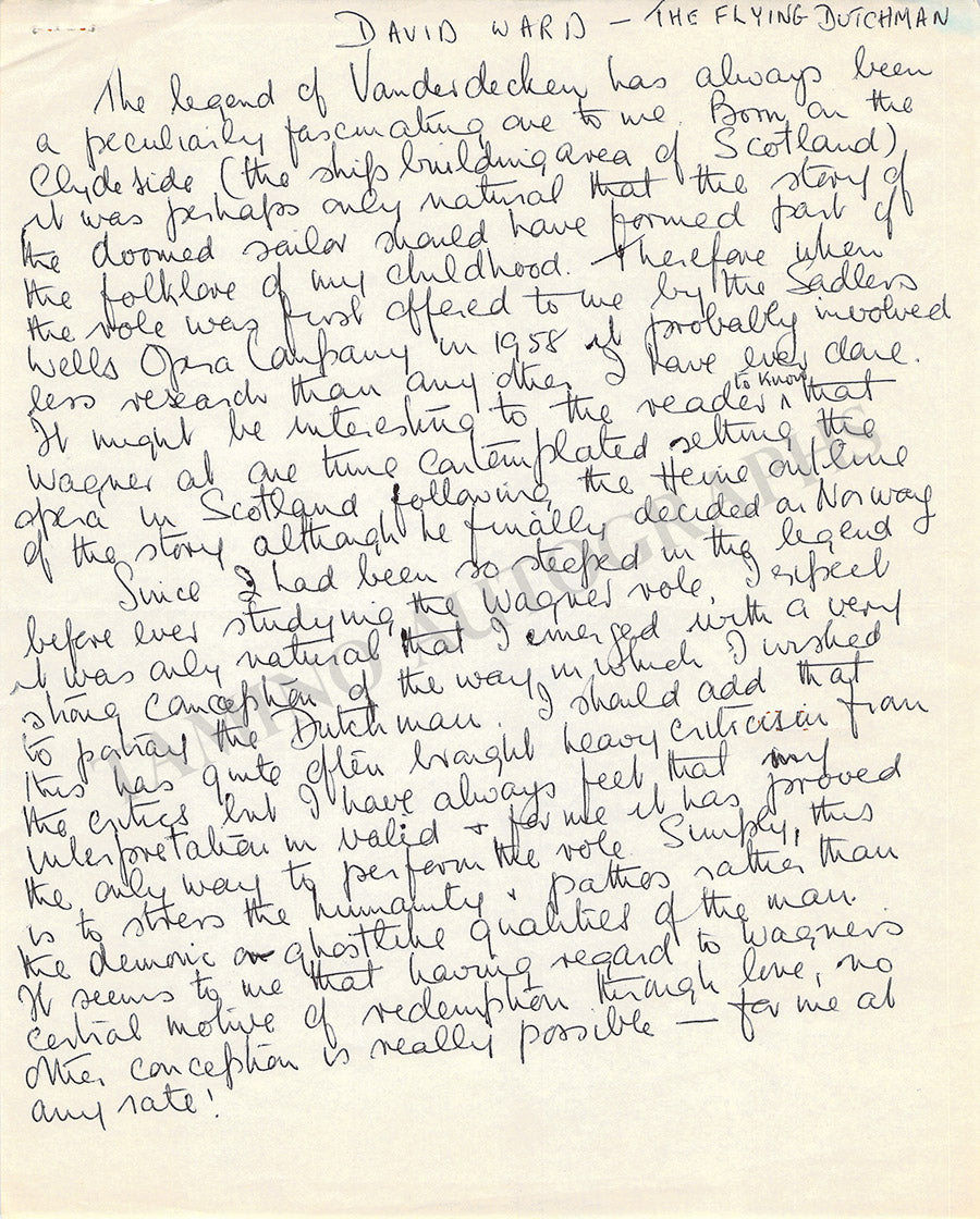 Scottish bass (1922-1983), especially known for his Wagnerian interpretations. 1 autograph letter signed by his wife Susan Ward written on his behalf, 2 pages, dated in London in 1965, size is 6 x  8 inches, in excellent condition. Also included: handwritten three page essay by him discussing Wagner's opera The Flying Dutchman ( a role with which he was particularly associated), also dated in 1965, 8 x 10 inches, in excellent condition. Not sold separately.