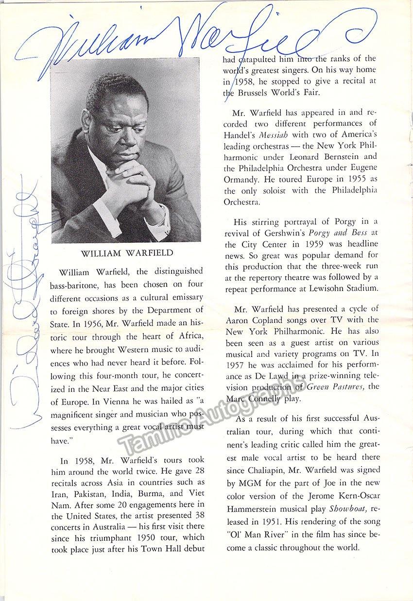 Program for a recital of the American bass-baritone at The Queens College, New York, on May 19th, 1962, signed by him and the pianist Willard Straight on the bio page.  Size is 6.25 x 9 inches, folds, in very good condition.
