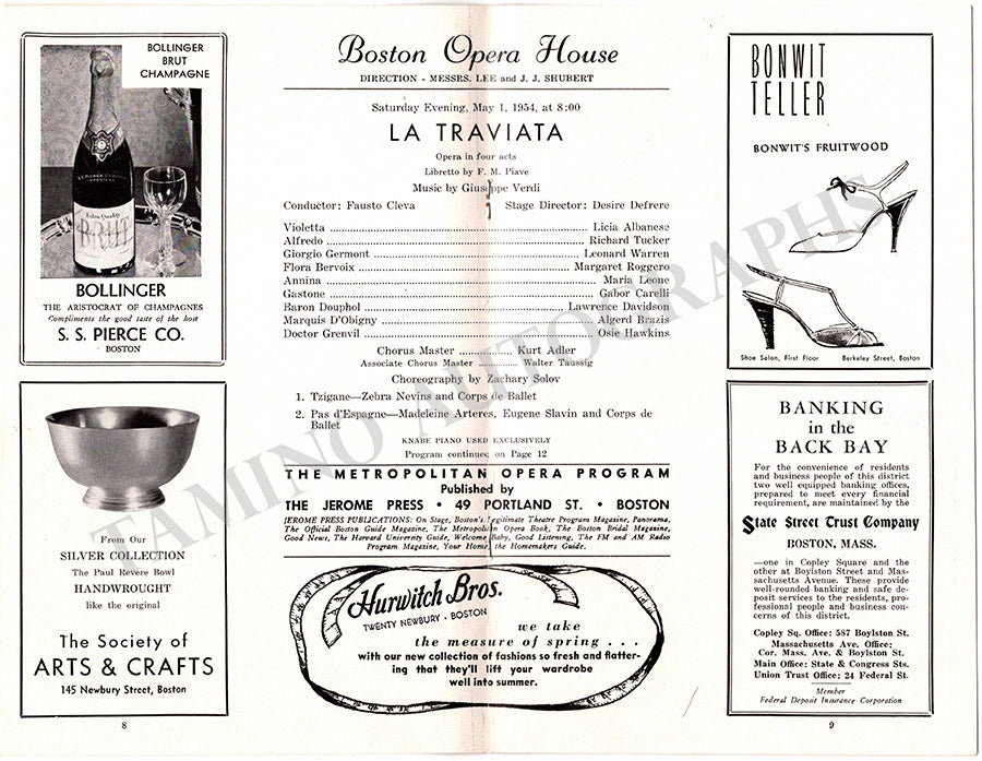 Star American baritone (1911-1960) and Italian soprano (1909-2014), full program for a performance of Verdi's La Traviata presented by the Metropolitan Opera on tour at the Boston Opera House in 1954, signed by both artists on the cover page. Full program, containing all pages and covers, size of each page is 6.25 x 9.75 inches, in excellent condition.