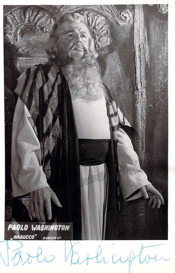 Signed photo, shown as Dr. Dulcamara in Donizetti's Elisir D'Amore, dated in 1976. Stamped on verso by photographer De Rota, Trieste. Size is 5 x 7 inches, in excellent condition.