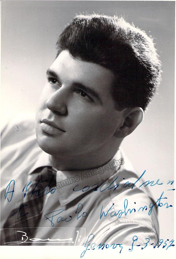 Signed photo, shown as Giorgio in Bellini's I Puritani. Inscribed and dated in 1967. Stamped on verso by photographer Marchiori, Florence. Size is 4 x 5.5 inches, in excellent condition