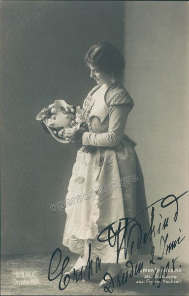 Signed photo postcard of the German soprano (1868-1944), shown as Susanna in Le Nozze di Figaro, dated by her in Dresden in 1908. Size is 3.5 x 5.25 inches, in excellent condition