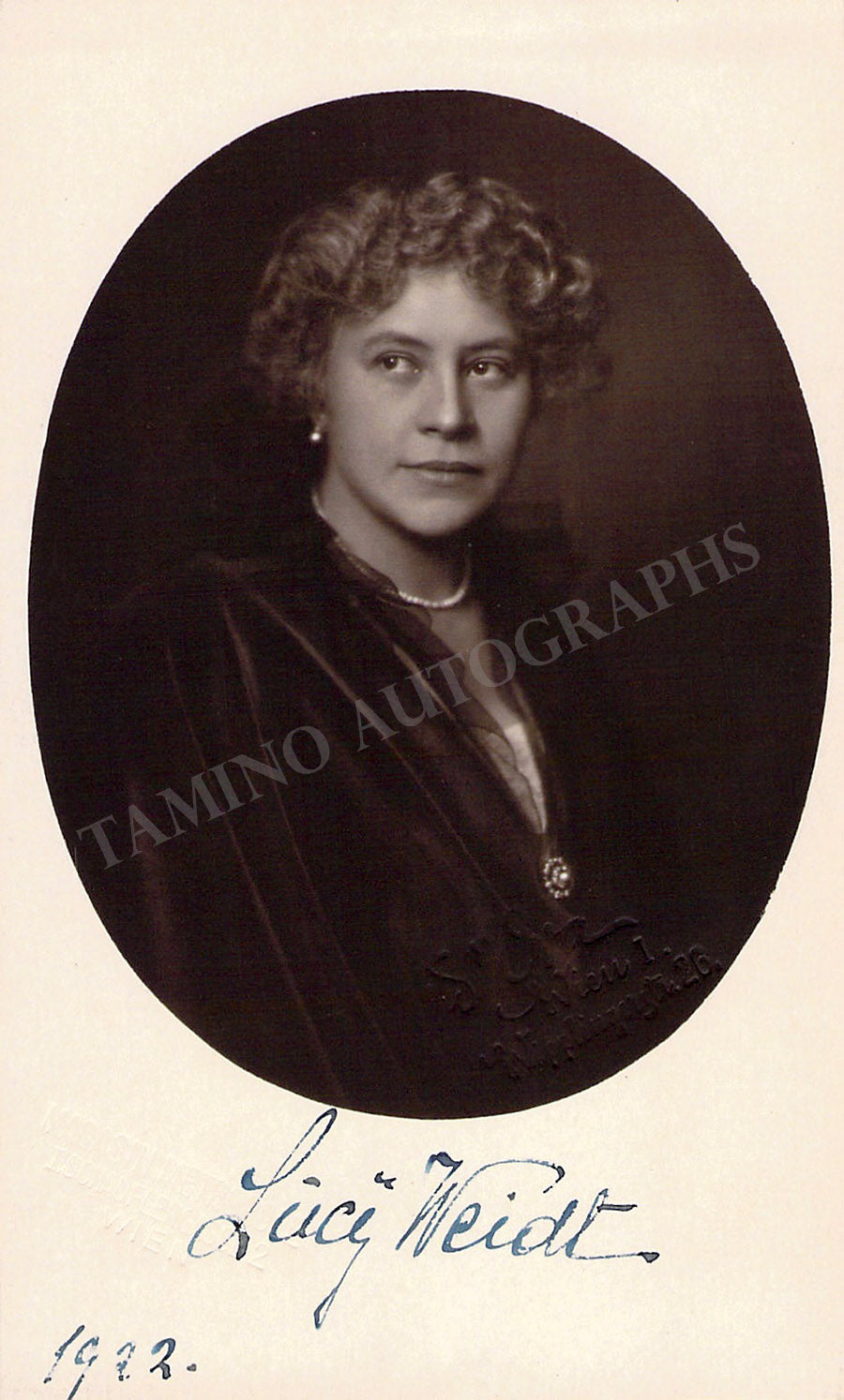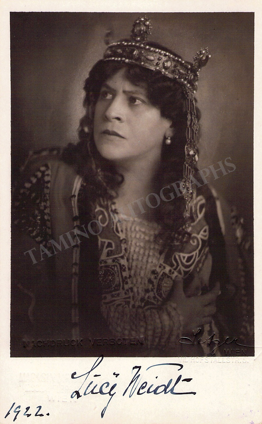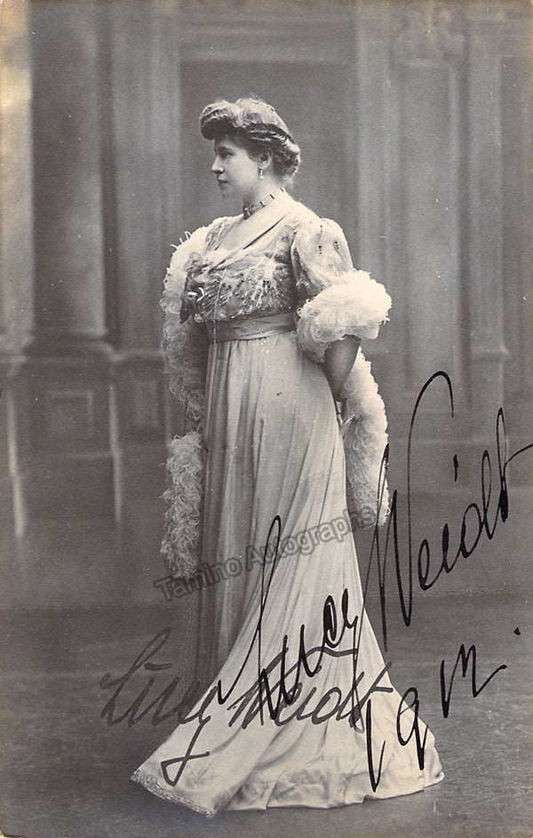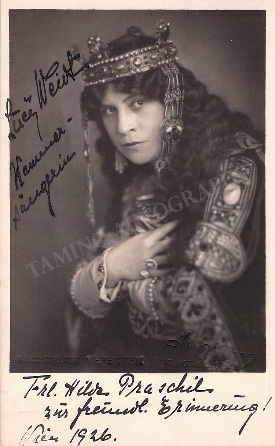 Signed postcard photograph, shown as the Marschallin in Richard Strauss's Der Rosenkavalier. Bold handwriting and signature. Blind stamped on front by both photographer Setzer, Vienna and Magasin Metropole photo studio, Vienna. Size is 3.25 x 5.25 inches, in excellent condition.