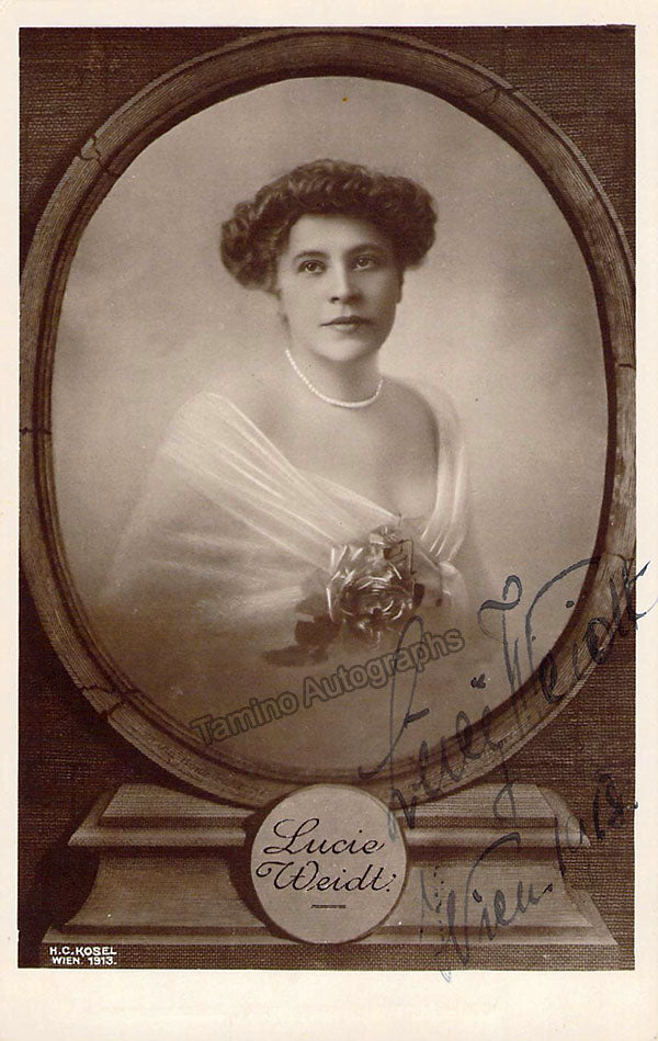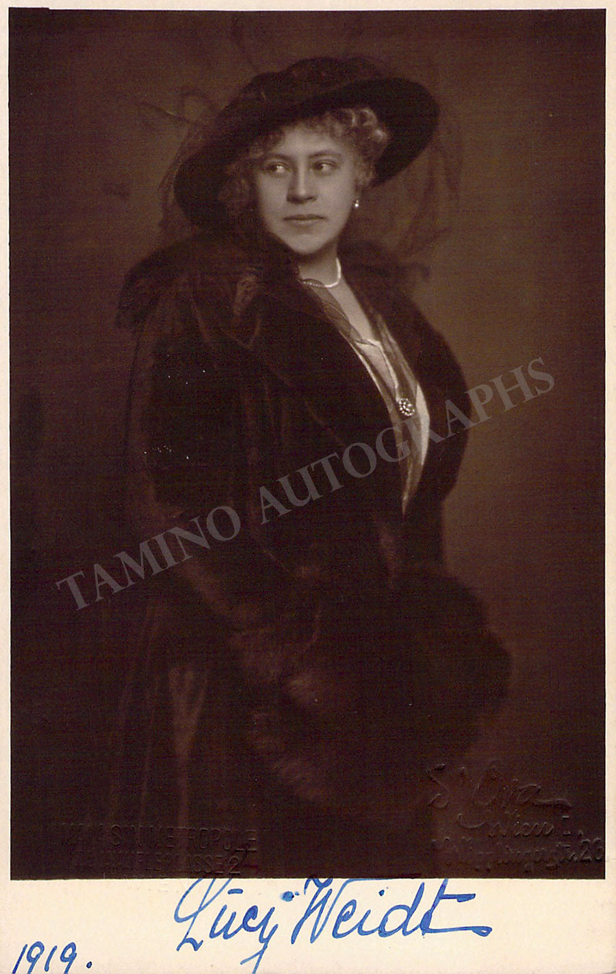 Signed photo postcard, shown as herself, dated in 1912. Stamped on verso by photographer Ignaz Kugle, Vienna. Size is 3.4 x 5.4 inches, in excellent condition.