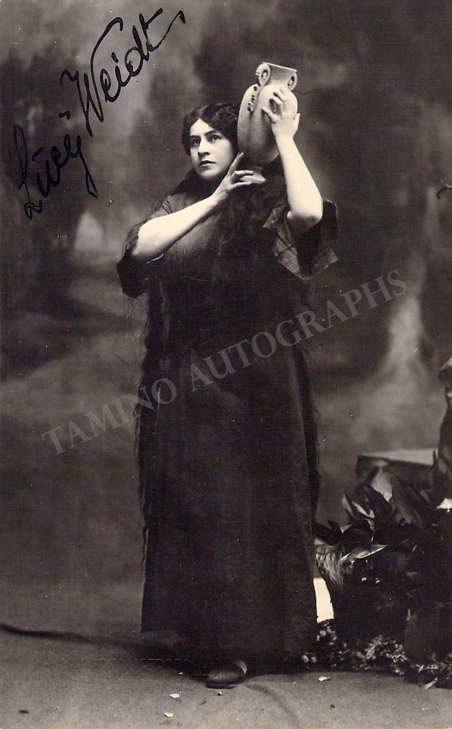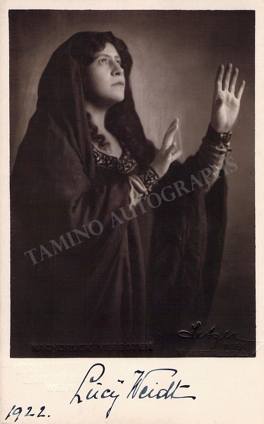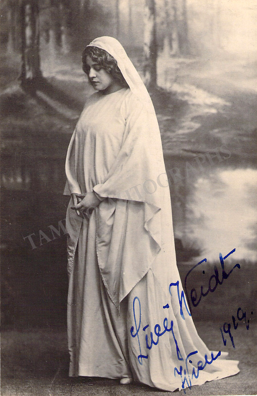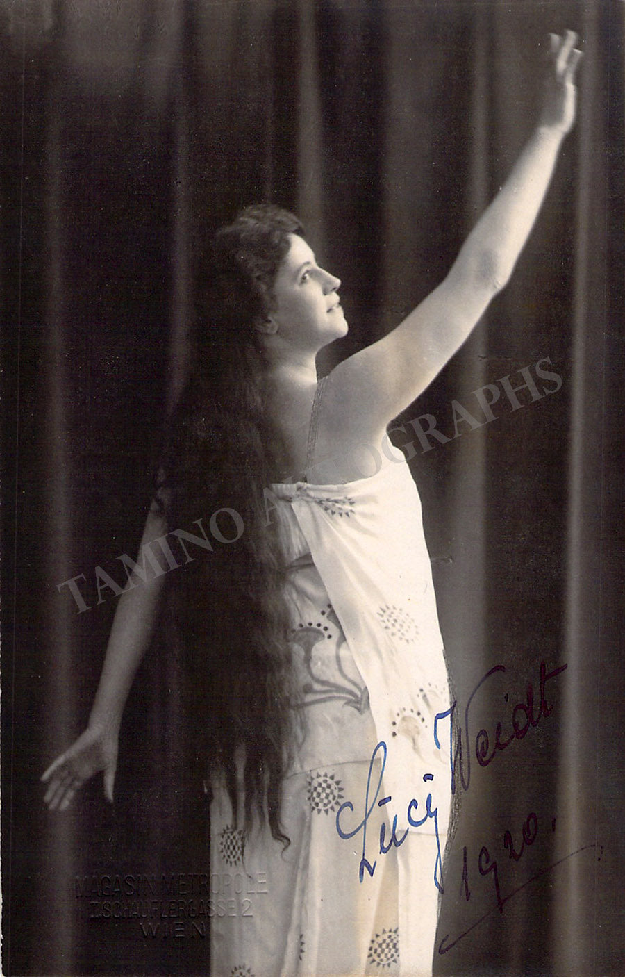 Signed postcard photograph, shown in the title role of Richard Strauss's Elektra, dated in Vienna in 1920. Blind stamped on front by Metropole Magazine photography studio, Vienna. Size is 3.5 x 5.5 inches, in excellent condition.