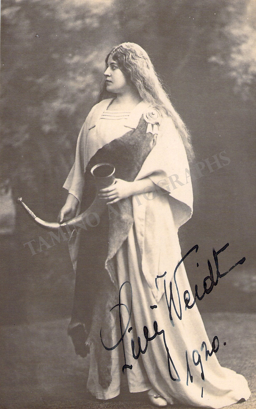 Signed postcard photograph, shown in role (likely as Isolde in Wagner's Tristan und Isolde), dated in 1920. Size is 3.25 x 5.25 inches, in excellent condition.