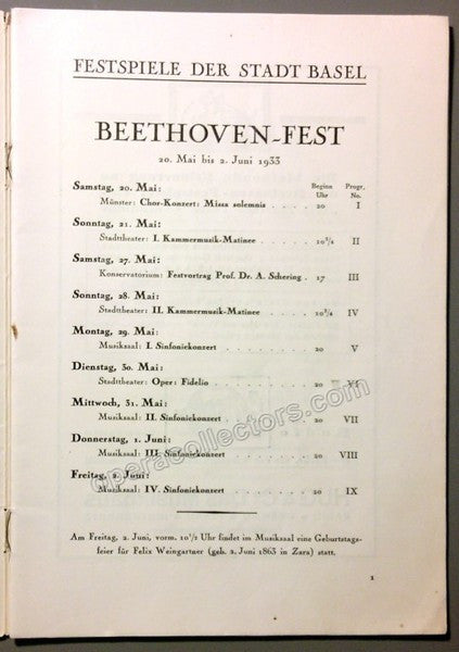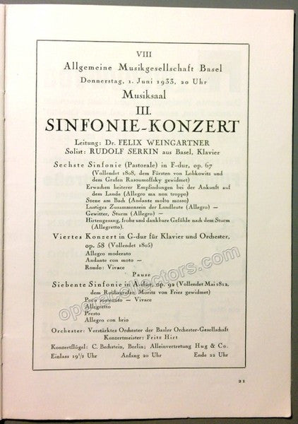 Felix Weingartner conducts Festspiele der Stadt Basel, Beethoven-Fest, 20 may - 2 june 1933. Basel Symphony Orchestra. Soloists: Adolf Busch, Rudolf Serkin. Complete booklet, 24 pages plus covers (which are loose), 5.75 x 8.25 inches, in very good condition