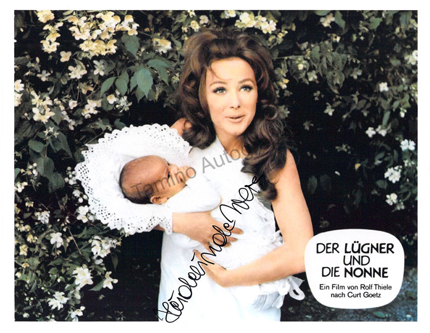 Beautiful color promo photograph signed by her, shown in the 1967 film "Der Lügner und die Nonne" (The Liar and the Nun).  Size is 10.1 x 8 inches, in excellent condition.