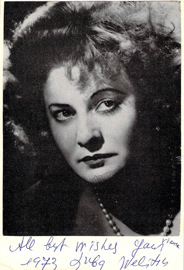 Signed postcard photograph, shown as herself, dated in 1951. Stamped on verso by Fayer photographers, Vienna. Size is 3.25 x 5.25 inches, in excellent condition.