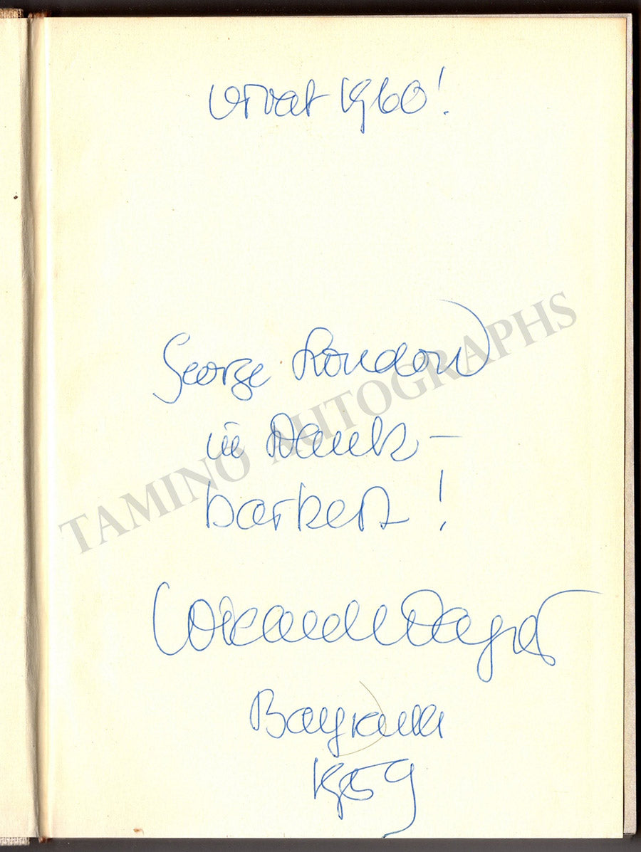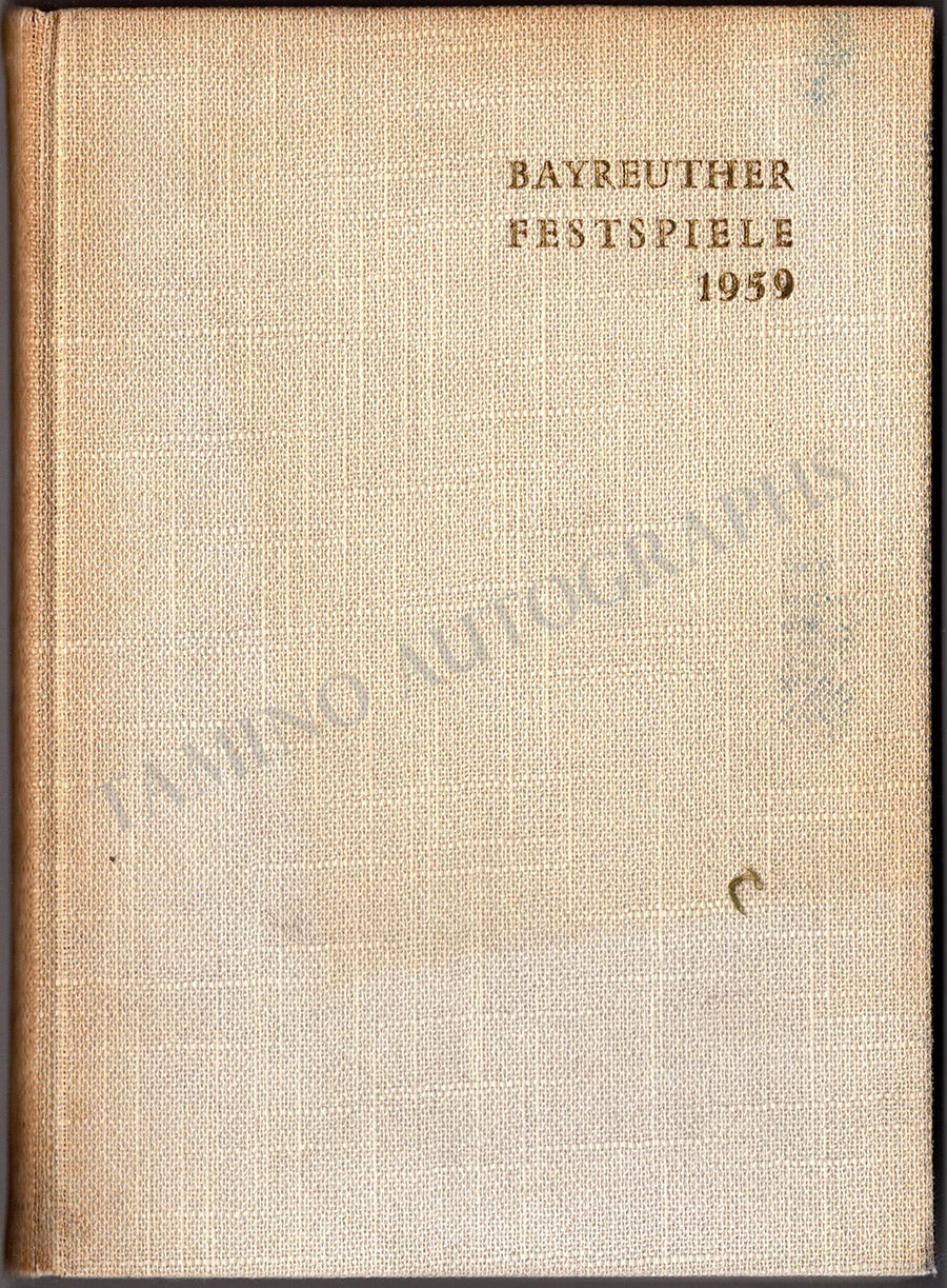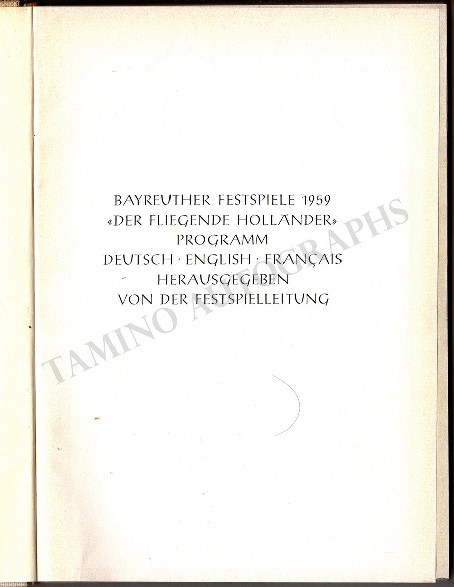 Volume signed by him on the front end page, dedicated to the American baritone George London, compiling the programs for the 1959 performances of Der Fliegende Höllander, Die Meistersinger von Nüremberg, Parsifal, Lohengrin, Tristan und Isolde at the Bayreuth Festival plus an insert with the Bayreuth Festival personnel.