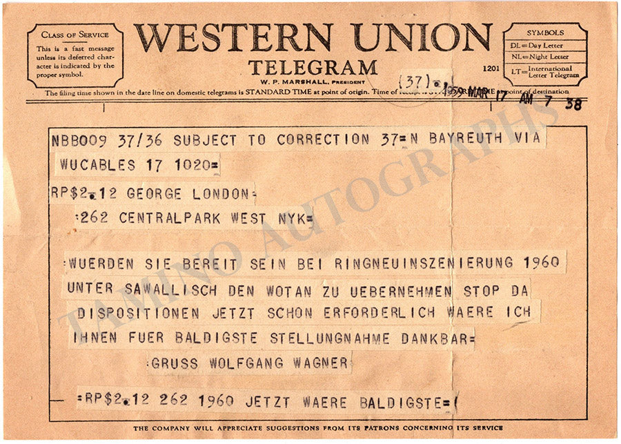 ALSO INCLUDED is a telegram from Wolfgang Wagner to George London about a performance.