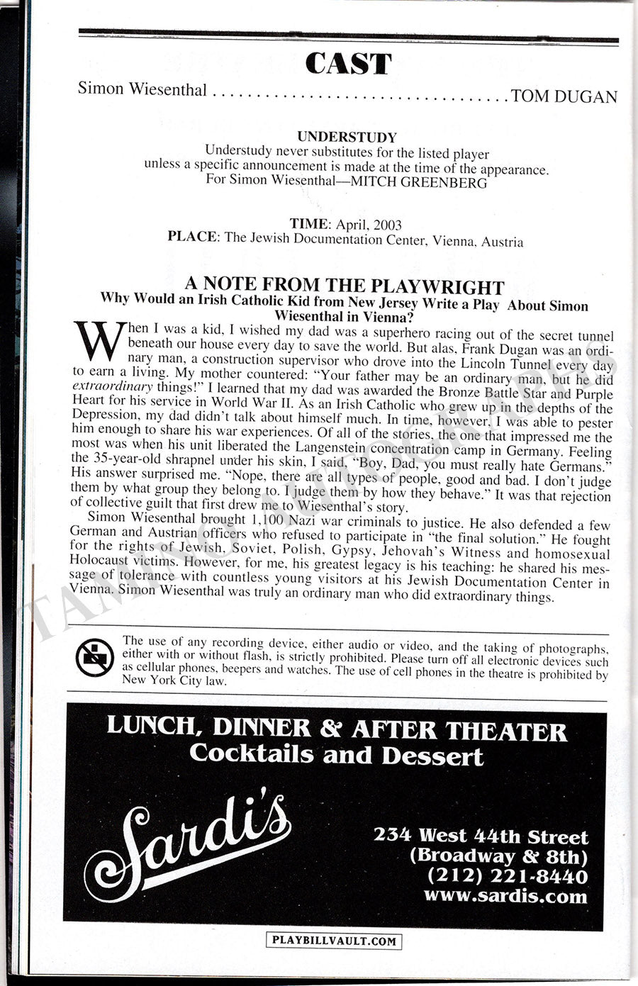Original playbill for a Broadway production of the musical Wiesenthal at The Acorn Theatre featuring Tom Dugan as Simon Wiesenthal, and signed by him.