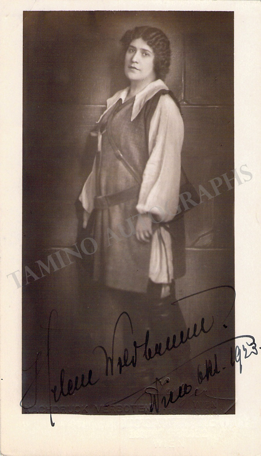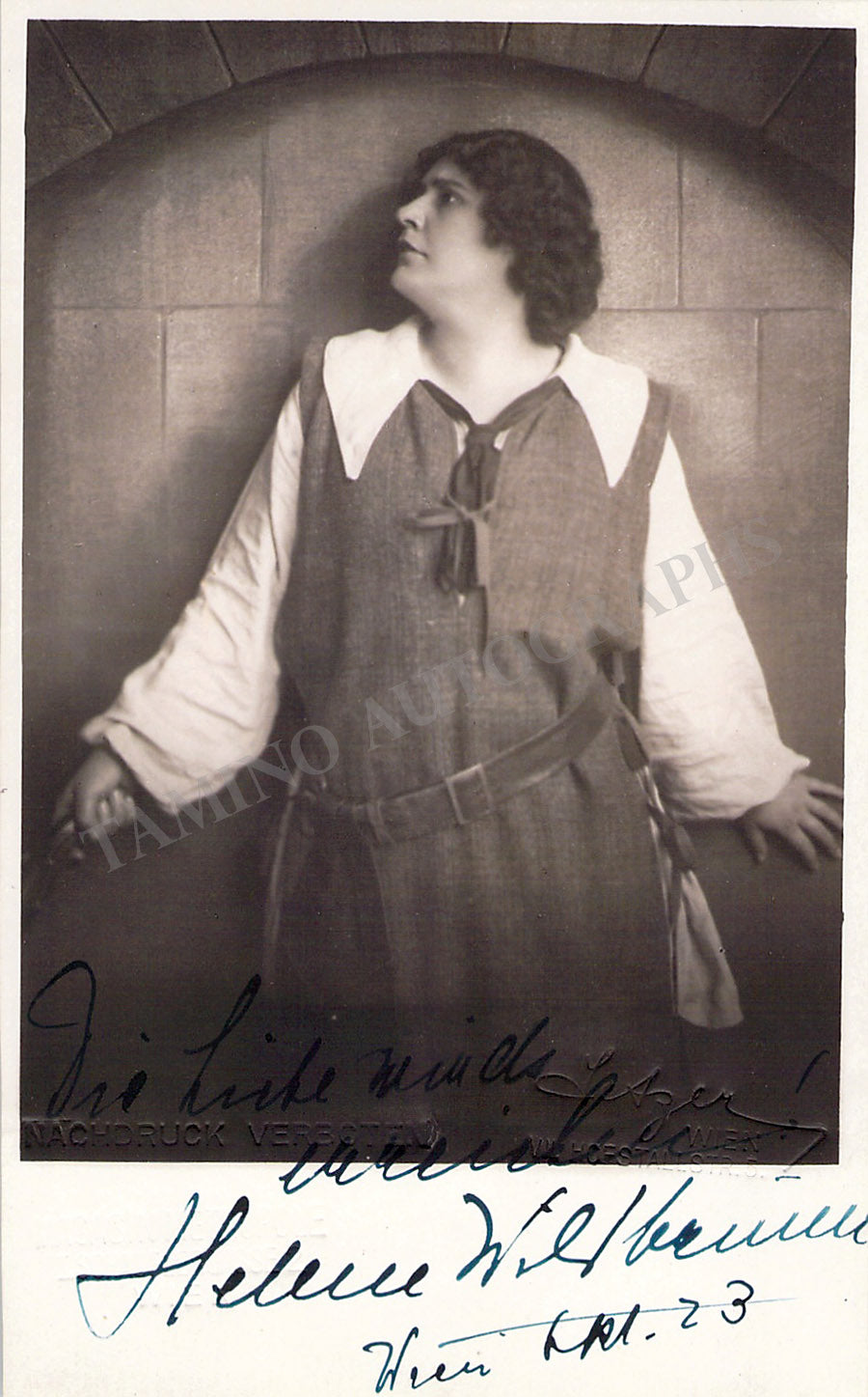 Signed postcard photograph, shown in the title role of Beethoven's Fidelio, dated in Vienna in 1923. Blind stamped on front by both Magasin Metropole photo studio and by photographer Setzer, Vienna (Setzer is also stamped on verso). Size is 3 x 5.25 inches, in excellent condition.