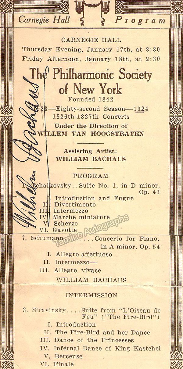 Clip from a program signed by him in 1924, for a performance at Carnegie Hall, New York. Size is 3.75 x 6.7 inches, in excellent condition.