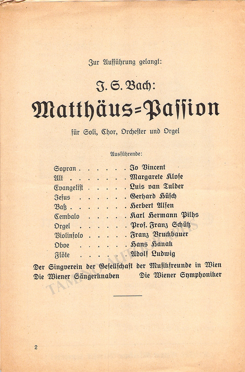 Program for a performance of Bach's St. Matthew's Passion. Size is 6 x 9 inches, full program with all pages and covers, in excellent condition.