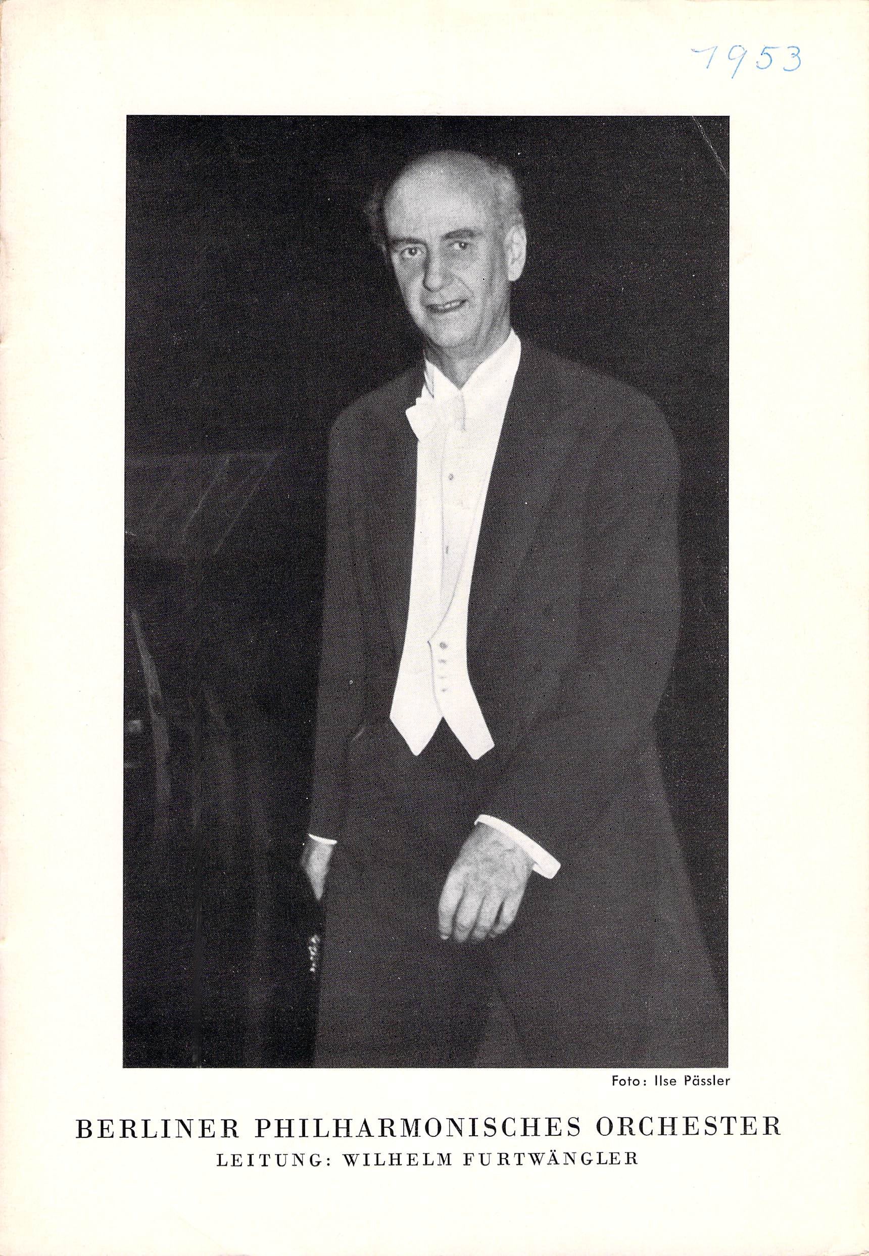 Program (unsigned) for a performance of Beethoven's 1st symphony and Furtwangler's own symphony by the Berlin Philharmonic at Manheim, on January 18th, 1953, under the baton of the German conductor.  Size is 5.9 x 8.1 inches, full program with all pages and covers, in excellent condition.