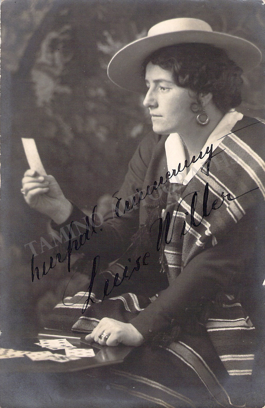 Signed postcard photograph, shown in role (likely the title role of Bizet's Carmen). Blind stamped on front by photographer Joseph Paul Bohm, Munich. Bold handwriting and signature. Size is 3.5 x 5.25 inches, some silvering and slight paper loss on edges, otherwise in excellent condition.