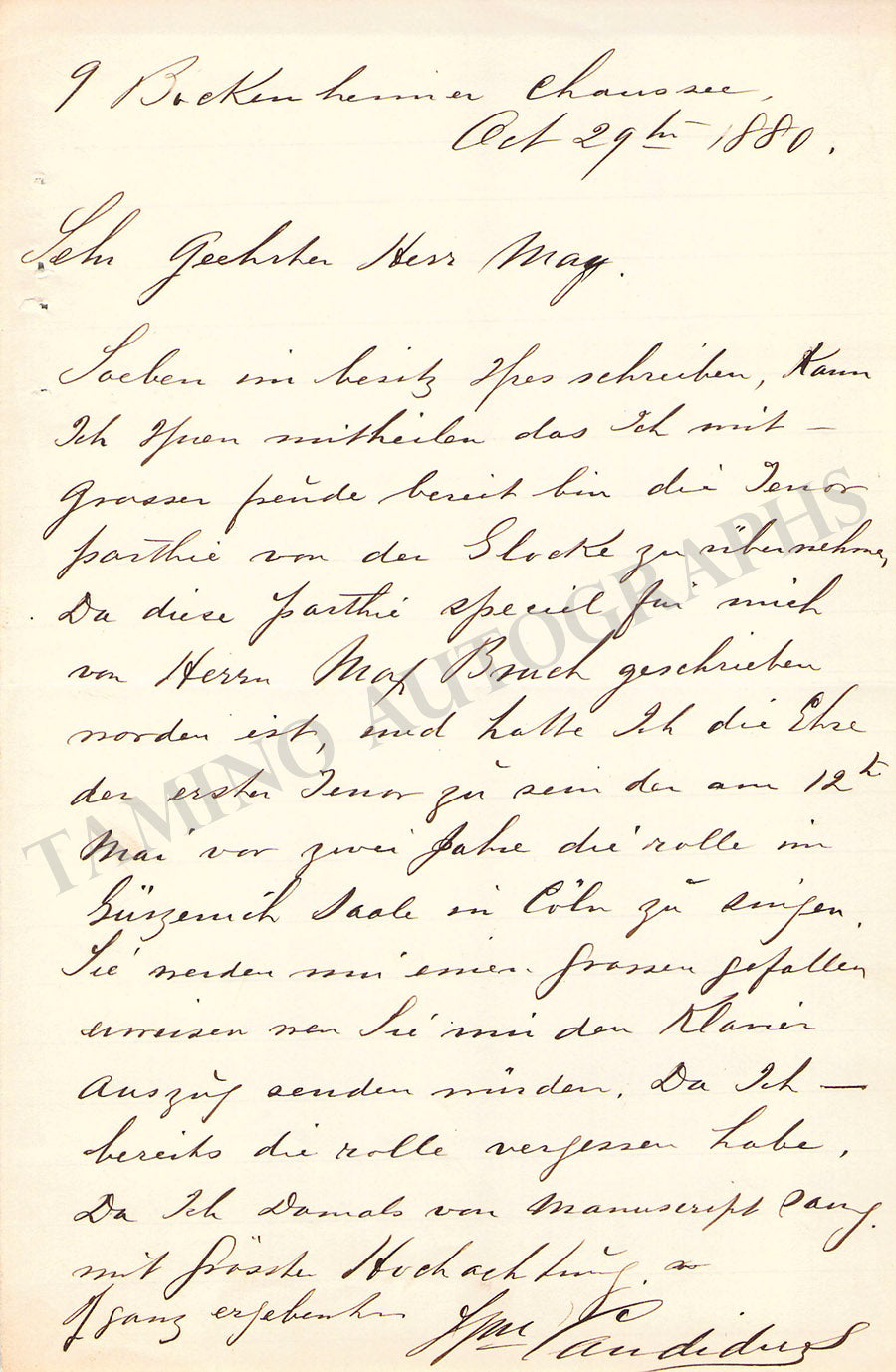 Autograph letter in German (untranslated) signed by him, dated October 29, 1880, addressed to Mr. May, saying "I am very happy to take over the tenor part of the Glocke since this part was written especially for me by Mr. Max Bruch, and I had the honor of being the first tenor to sing the role in Gürzenich Saale in Cologne on May 12th, two years ago...”.