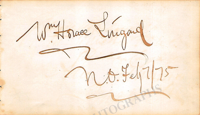 Album page signed by him, dated in New Orleans, February 1875. Size is 6.75 x 3.9 inches, in excellent condition.