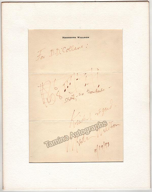 Autograph music quote on a sheet of paper with his letterhead, inscribed and dated in 1973, with three bars of music from his "Seventy-Six Trombones" theme from the musical "The Music Man".  Music quote is matted to a total size of 11 x 14 inches (quote is 7 x 10 inches -visible window size), some fading, folds, but in overall very good condition.
