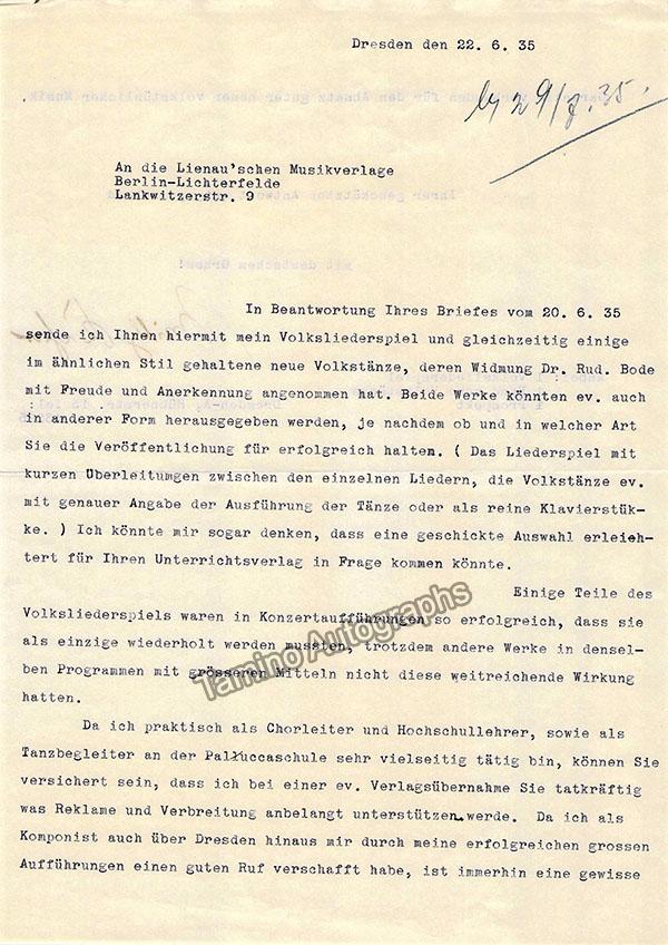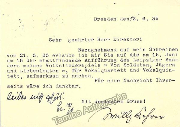 Two typed letters signed, each one dated in 1935, in German (sold untranslated). One letter is 2 pages, sized 8 x 11.25 inches, the other is a postcard sized 5.75 x 4 inches, both in excellent condition.