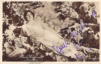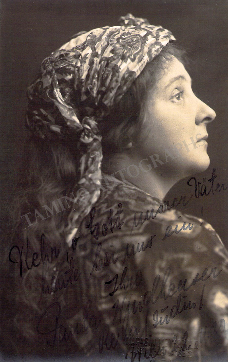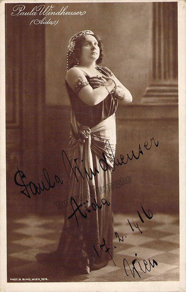 Signed postcard photograph, shown in the title role of Verdi's Aida, inscribed, dated in Vienna in 1916. Photo by B. Bing, Vienna. Size is 3.5 x 5.5 inches, in excellent condition.
