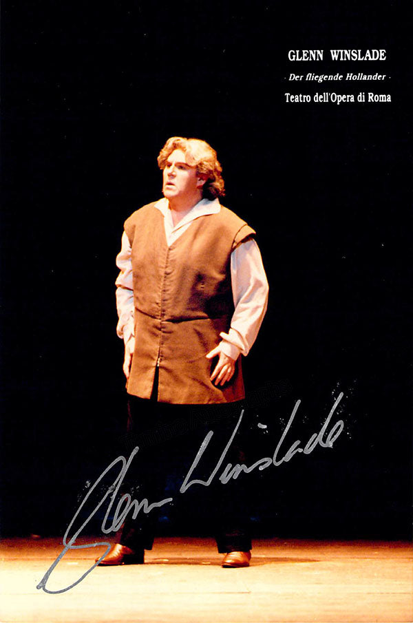 Australian tenor (b. 1958), signed photograph, shown as Erik in Wagner's Die Fliegende Hollander. Bold and clear signature. Photo by Maria Falsani, Rome. Size is 4 x 6 inches, in excellent condition.