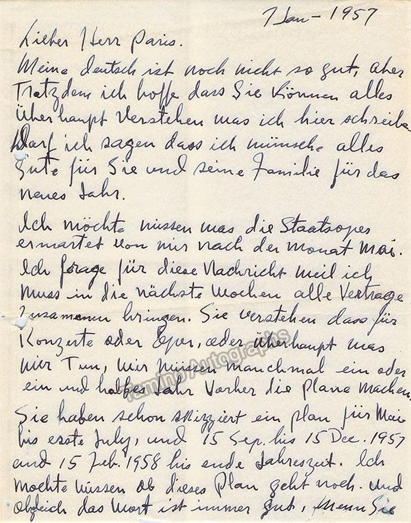 American bass-baritone (1915-1965), autograph letter signed, dated in 1957. 2 pages of carbon paper, written in German, sold untranslated. Each page is 8 x 10 inches, with 2 bullet holes per page and slight tear on second page, otherwise in very good condition.