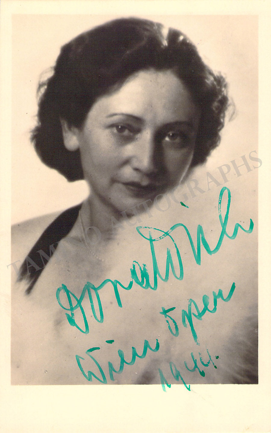Austrian mezzo-soprano (1900-1965), signed postcard photograph, shown as herself, dated in Vienna in 1944. Stamped on verso by photographer Rich Reznicek, Vienna. Size is 3.5 x 5.5 inches, in excellent condition.
