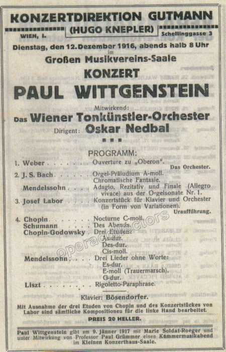 Concert with Oskar Nedbal conducting Vienna Tonkunstler Orchestra, Weber Josef Labor Concert piece for piano and orchestra (world premiere) Bach Mendelssohn Chopin Schumann Liszt, 2 pages