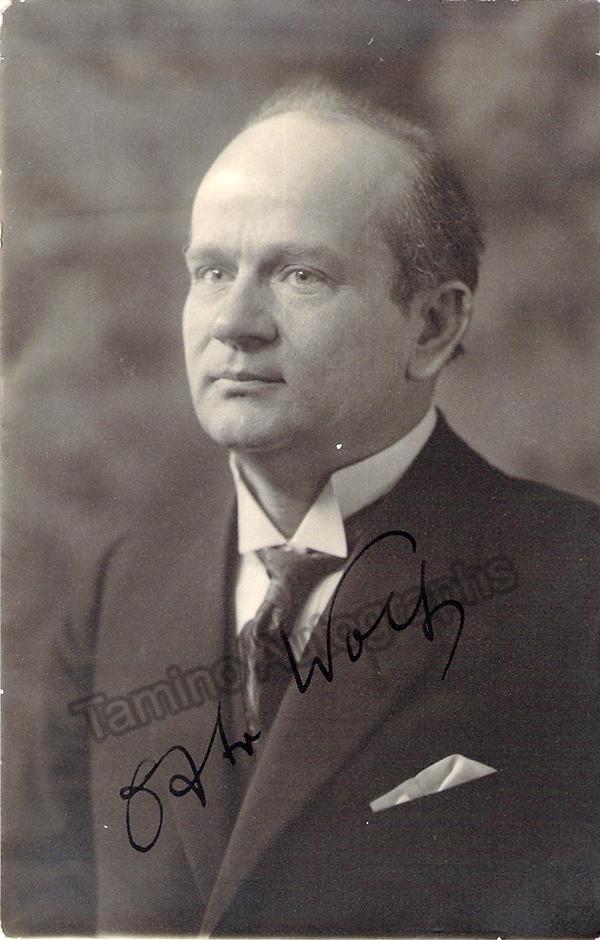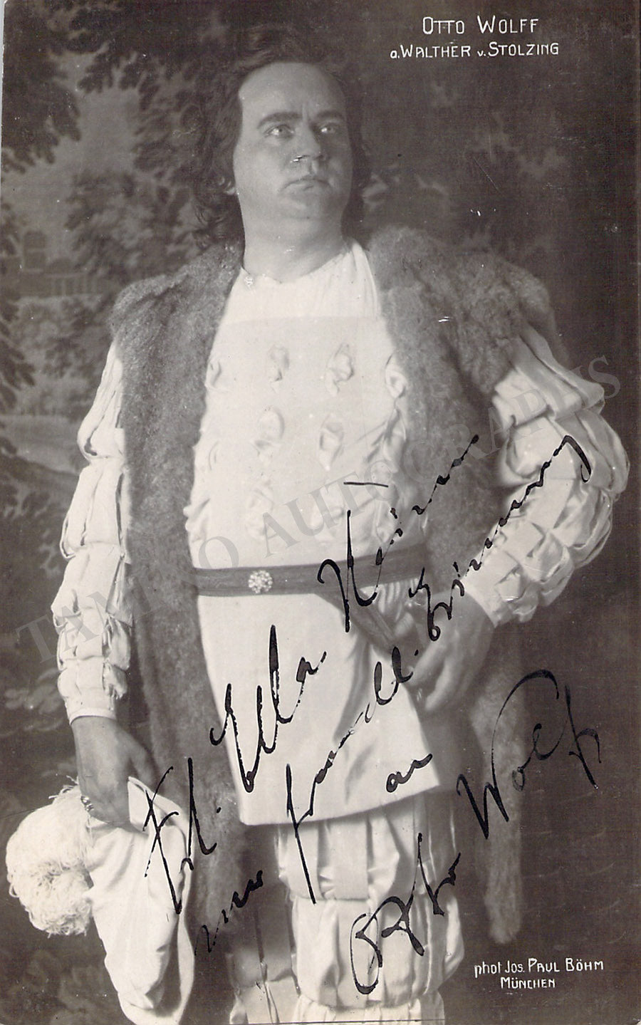 Signed postcard photograph, shown as Walter von Stolzig in Wagner's Die Meistersinger, inscribed. Photo by Joseph Paul Bohm, Munich. Size is 3.5 x 5.5 inches, in excellent condition.