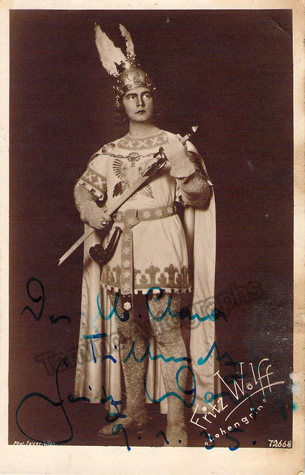 German tenor (1894-1957), signed photo postcard, shown in the title role in Lohengrin. Inscribed and dated in 1945. Size is 3.5 x 5.5 inches