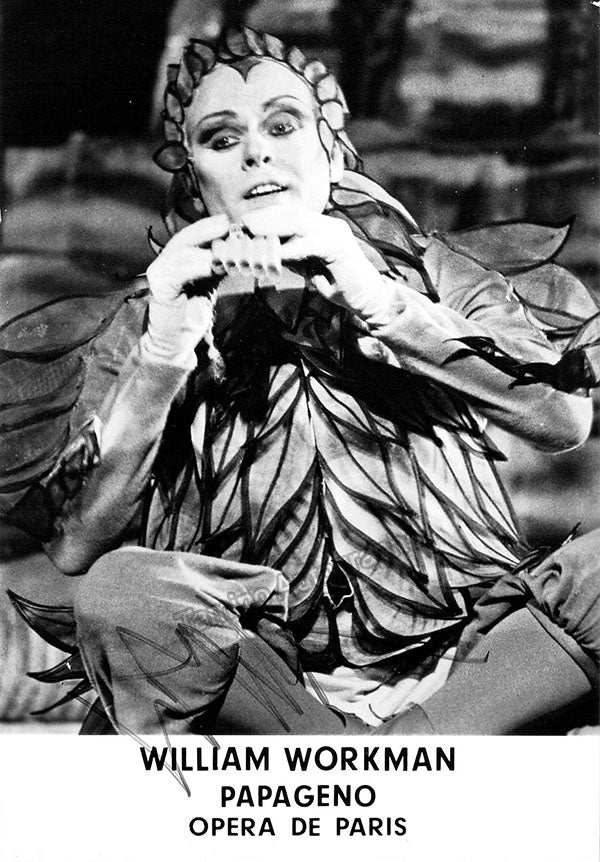 American baritone (1940-2019), particularly active with the Hamburg opera, notably created the roles of Tony in the world premiere of Gian Carlo Menotti's Help, Help, the Globolinks! in 1968  and Prince Henri of Conde in the world premiere of Krzysztof Penderecki's The Devils of Loudon in 1969. Signed photograph, shown as Papageno in Mozart's Die Zauberflote. Stamped on verso by photographer Colette Masson, Boulogne. Size is 4 x 5.75 inches, in excellent condition.
