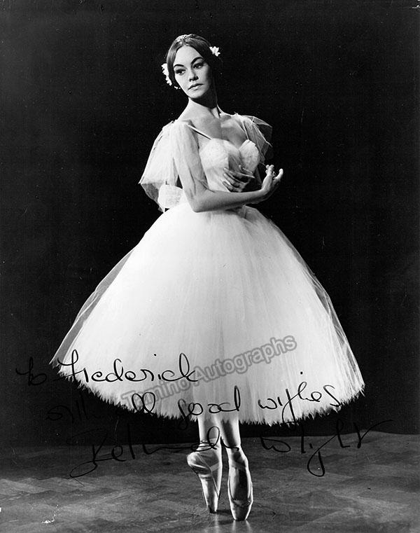 English ballerina (1929-2007), noted for romantic and classical roles. Signed photo, inscribed, shown in performance. Size is 7.5 x 9.5 inches, minor creases otherwise in very good condition.
