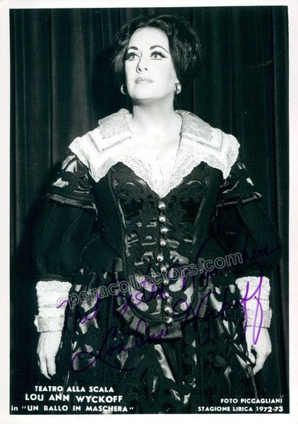 American soprano (b. 1942), signed photo, shown in role in Un Ballo in Maschera. Size is 4 x 5.75 inches.