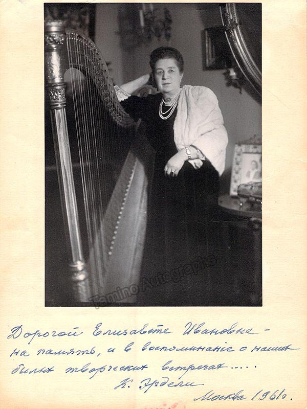 Ukrainian harpist (1878-1971). Considered one of the greatest harp players of the 20th century. Signed album page attached with a nice photo of her with the harp, dated in 1961, Moscow. Inscribed. Size is 7 x 9.25 inches, in excellent condition.