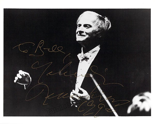 Nice black-and-white photograph signed and inscribed by him, dated 1990, shown conducting. Size is 9.9 x 7.9 inches, in excellent condition.