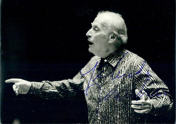 American violinist and conductor (1916-1999), considered one of the greatest violinists of the 20th century. Signed photo, shown conducting. Stamped on verso by photographer Schaffler, Salzburg. Size is 5.75 x 4 inches, in excellent condition.
