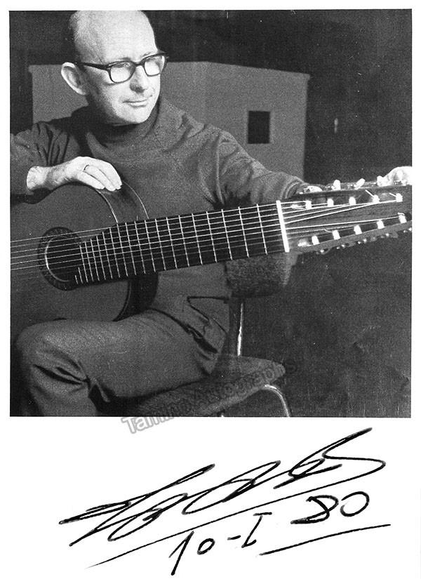 Spanish guitarist (1927-1997), one of the finest virtuoso classical guitarist of the twentieth century. Signed photo, shown with the instrument, dated in 1980. Size is 5 x 7 inches, in excellent condition.