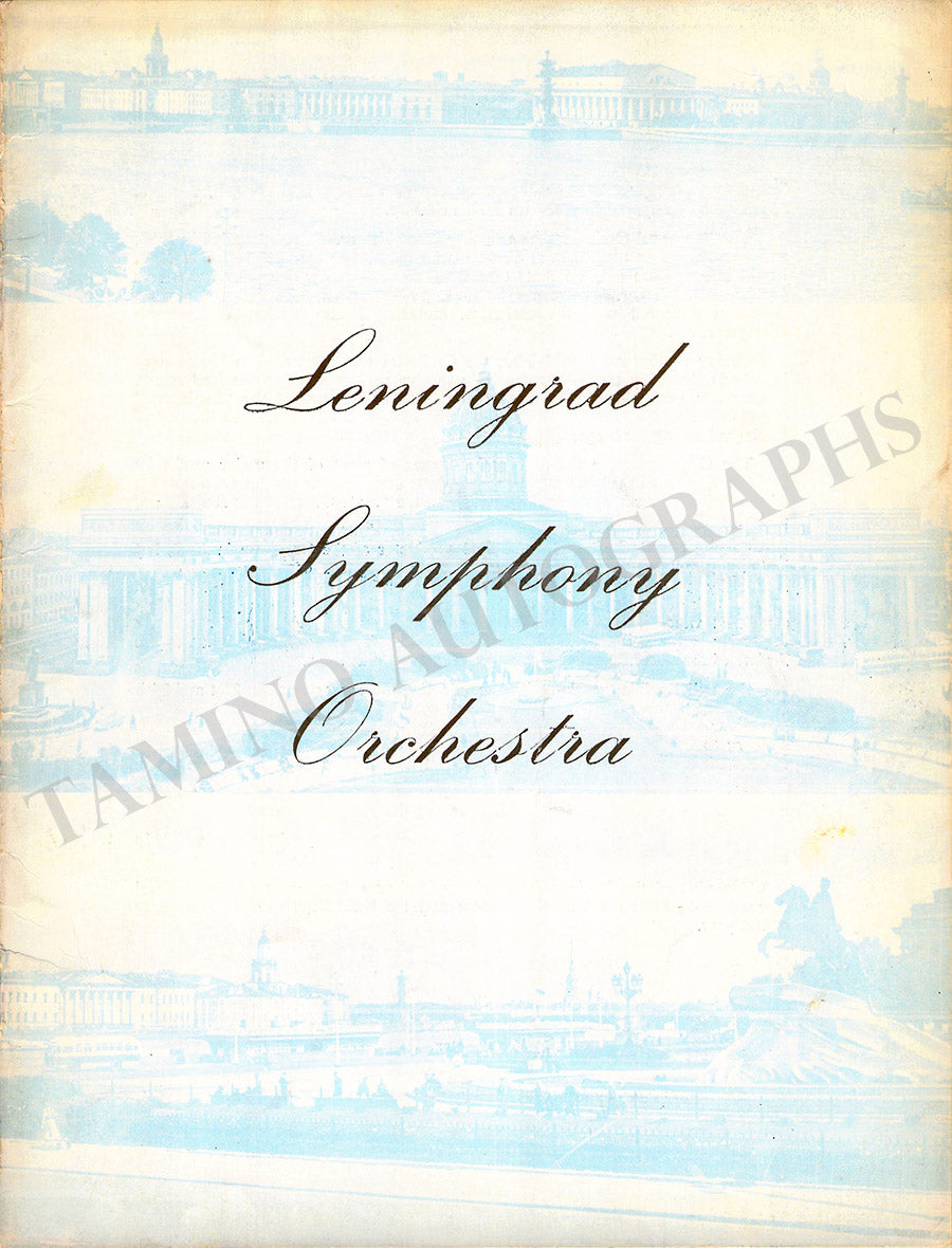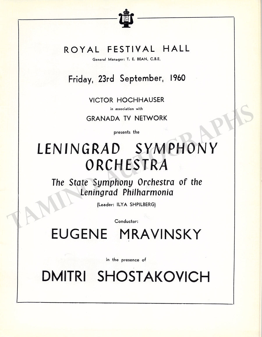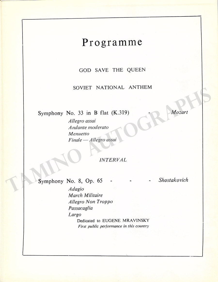 Program for a performance of Mozart's Symphony 33 and Shostakovich's Symphony 8 by the Leningrad Symphony Orchestra conducted by the celebrated Russian conductor Yevgeny Mravinsky at the Royal Festival Hall, London, on September 23, 1960, and signed by him on his photo page.