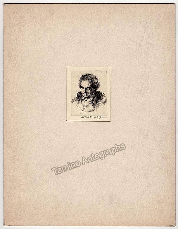 Print is 6 x 7.6 inches in total size, actual image is 1.75 x 2.25 inches, signed in pencil below by artist. Mounted inside a folder with a window to see image, includes a leaflet about this "Study of Young Beethoven" and an article from the Miniature Print Society magazine, October 1943, detailing about this print. All in excellent condition. See scan of full mat, and detail.
